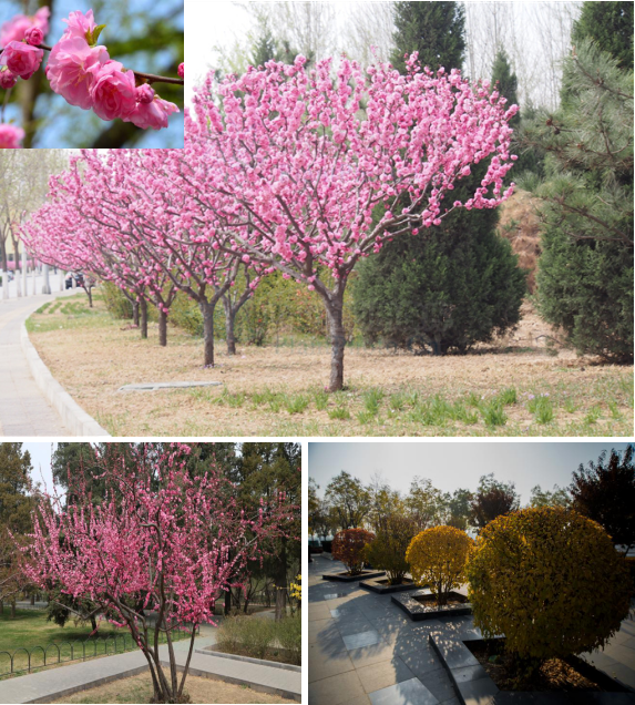 蔷薇科桃属灌木或小乔木,因叶片像榆树叶,花朵又像梅花,故得名“榆叶梅”,品种以花瓣区分为重瓣和单瓣。叶簇生或互生,叶片宽椭圆形至倒卵形,花先叶开放,花繁色艳,果实近球形。喜光,稍耐荫,耐寒,能在-35℃下越冬。对土壤要求不严,以中性至微碱性而肥沃土壤为佳。根系发达,耐旱,抗病虫。枝叶茂密,宜植于公园草地、路边,或庭园中的墙角、池畔等。与其他花色的植物搭配种植,在春季花盛开时候,花形、花色均极美观。