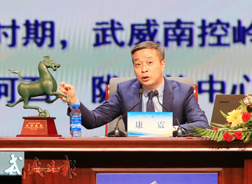 论坛上,康震以“走进武威 凉州归来”为题,从《凉州词》的经典记忆、汉魏六朝的凉州记忆、大唐王朝的凉州记忆、《凉州词》与凉州文化、凉州文化是中华文化兼容并蓄的一个重要标识等五个方面作了主旨演讲。