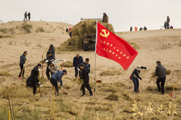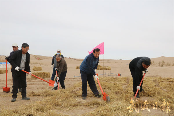 开沟、铺草、埋沙……早9时许,早早到达现场的各单位干部职工就在事先划分好的区域内热火朝天地干了起来。他们在技术员的精心指导下,严格按压沙规程和标准挥锹开沟、仔细铺草、规范埋压,配合默契,每道工序都一丝不苟。在大家的辛勤劳动下,一片接着一片、一块紧连一块,整齐划一的2000多亩草方格镶嵌在了连绵起伏的沙漠中,呈现出一片新的景色,宛若一张完美的画卷。