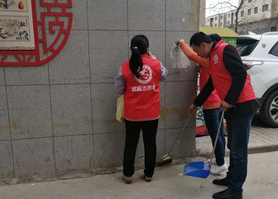 市农业综合行政执法队志愿者在古楼小区开展清理“牛皮癣”小广告和楼院死角垃圾清理志愿服务活动