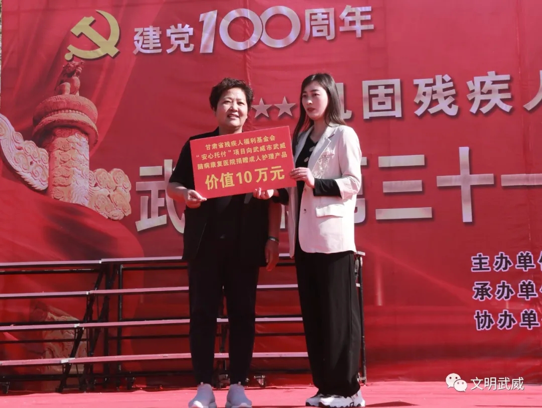 甘肃省残疾人福利基金会向武威市武威脑病康复医院捐赠了价值10万元护理产品。