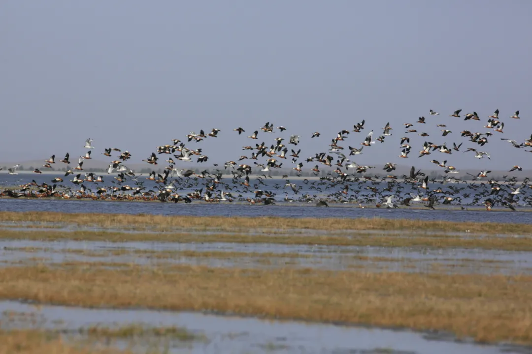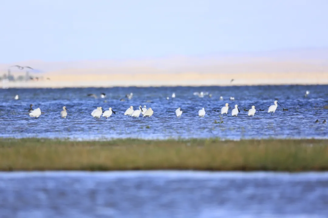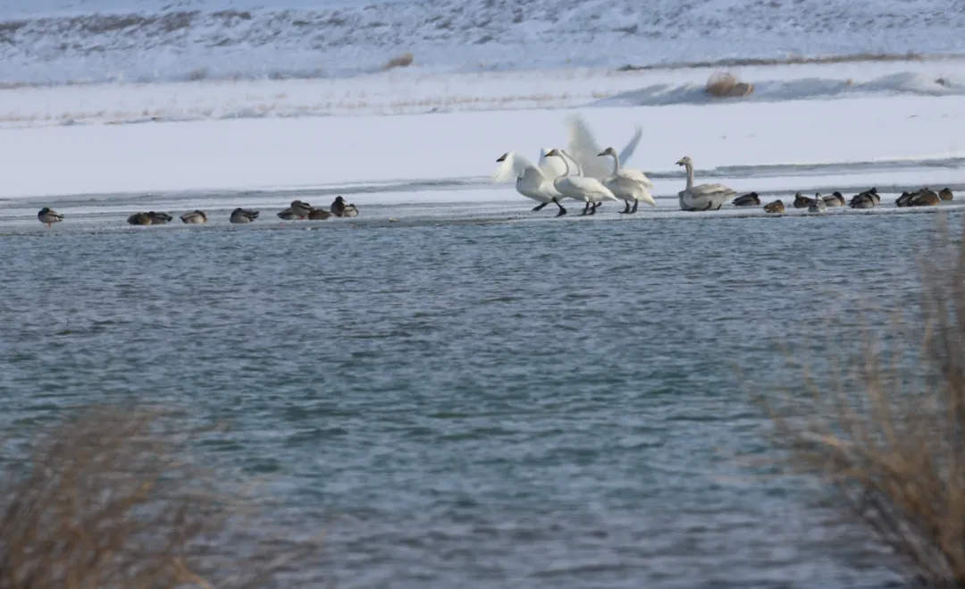 每年冬春季节,在民勤红崖山水库,黑颈鹤、斑头雁、赤麻鸭等野生动物陆续到来,有的在蔚蓝天空中展翅飞舞,有的在清澈的水面逐水嬉戏,每年在红崖山水库越冬的水鸟有80多种2万多只,特别是监测到由日本专家环志放飞的1T46和1T37环志大天鹅已接连6年在红崖山水库越冬,多年未见的国家Ⅰ级保护动物黑鹳、白尾海雕,Ⅱ级保护动物白琵鹭、灰鹤等珍稀鸟类频频出现,给民勤带来了勃勃生机。