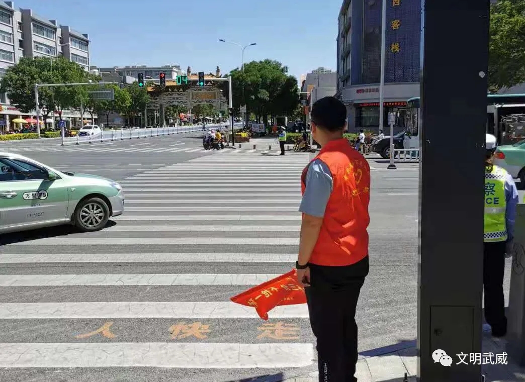 志愿者引导行人按红绿灯信号过马路,不闯红灯、不翻越护栏、 不走机动车道,劝导摩托车和电动车驾乘人员规范佩戴头盔,劝阻非机动车闯红灯、逆向行驶、不按规定车道行驶等不文明行为,强化市民文明交通意识,维护文明安全的交通环境,助推全国文明城市创建。