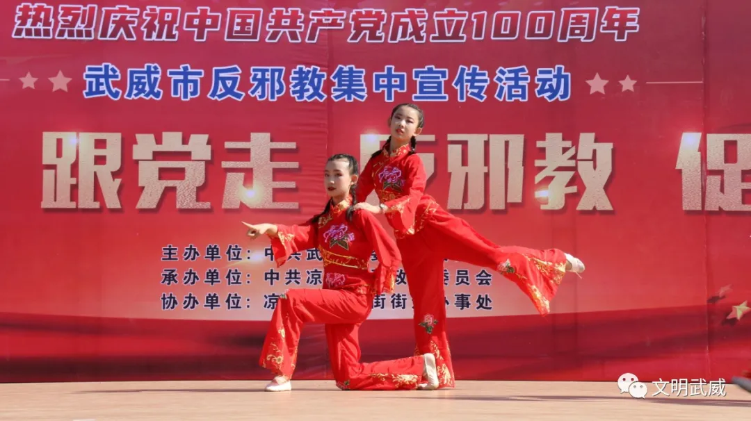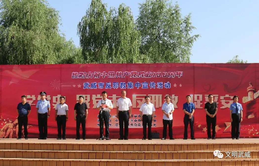 武威市“反邪教集中宣传月”启动仪式以“学党史、跟党走、反邪教、促平安”为主题,观看了中国共产党成立100周年成就展、反邪教警示教育宣传展板、警示教育宣传片,市民代表进行了发言,演出了“阳光生活 远离邪教”的文艺节目,发放了宣传资料,开展了法律、心理健康咨询,进行了干部群众千人签名活动等一系列形式多样、内容丰富的宣传教育活动。