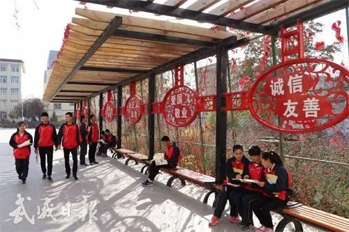 “富强、民主、文明、和谐……”国旗下,武威第十五中学全校师生齐声诵读24字社会主义核心价值观;操场周围,学生们自绘的“凉州八景”“勤俭节约”等为主题的、一面面“会说话的墙壁”将各种文明之礼娓娓道来。