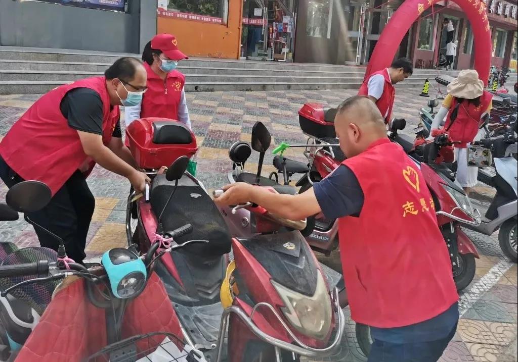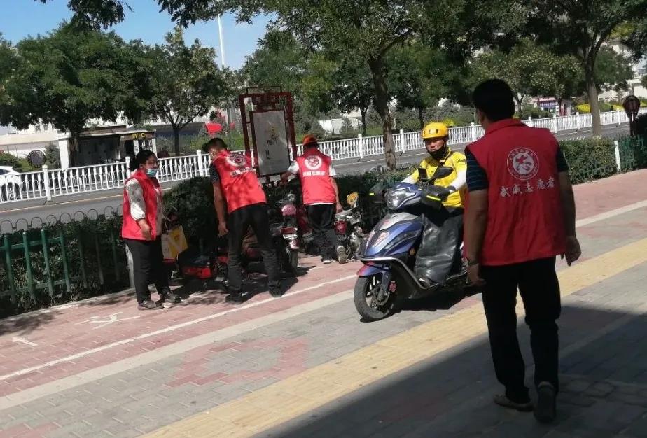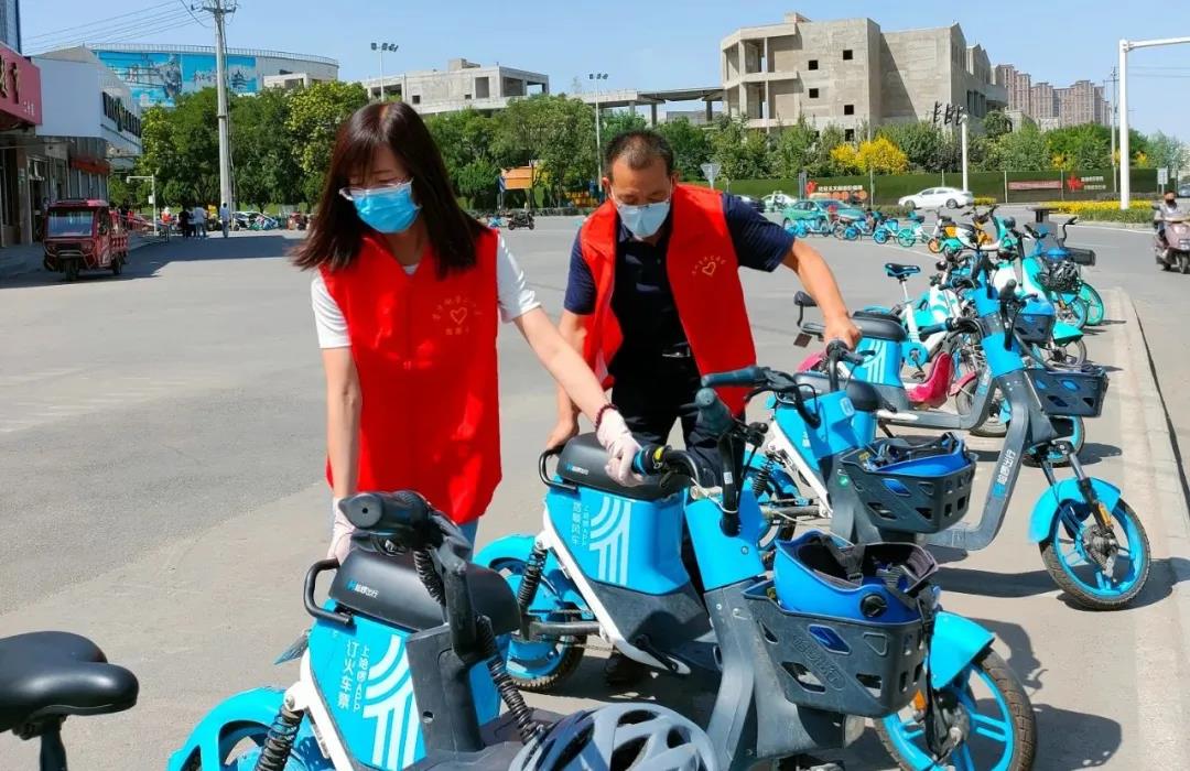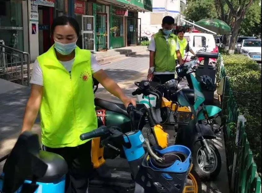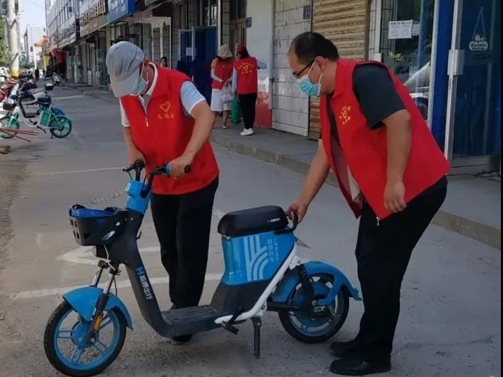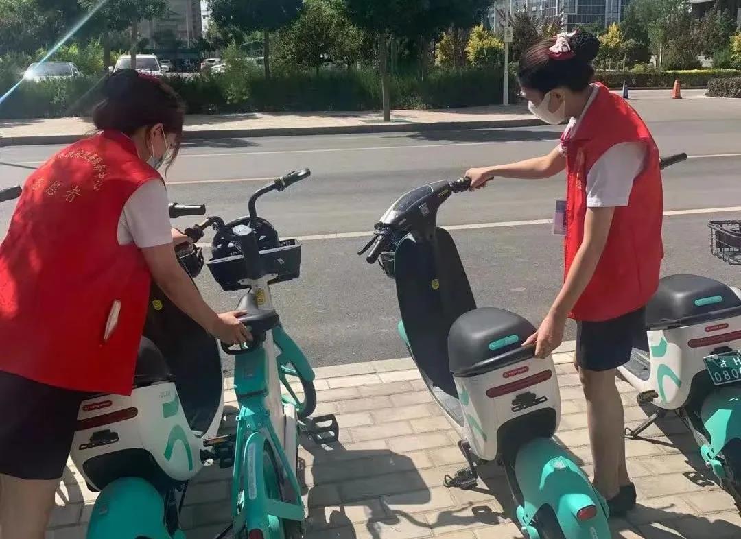 烈日炎炎,志愿者们引导市民有序停放单车,并对共享单车进行了清洁和有序停放,将零星停在路边的单车集中有序地摆放在制定区域,建设整洁有序环境。