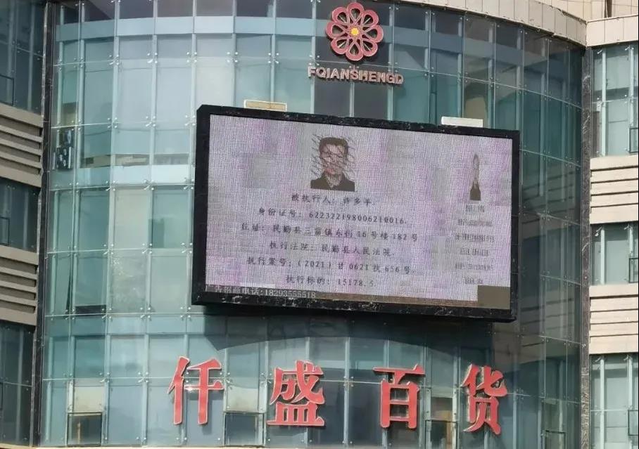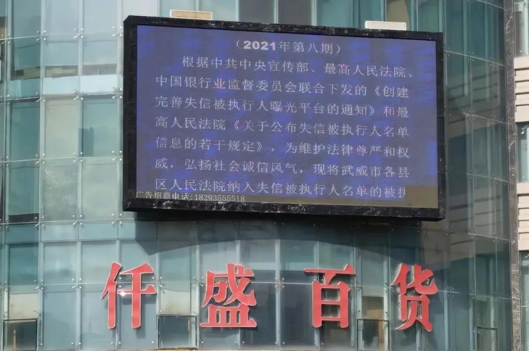 近期,武威大什字义乌商贸城大屏幕和凉州区人民法院户外LED大屏上滚动播放着一条特殊的广告”——全市两级法院所有失信被执行人名单。