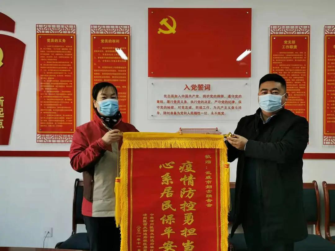 “衷心感谢市妇联对达府社区抗疫工作的大力支持,特送锦旗,略表谢意!”11月10日,凉州区西大街达府社区负责同志向市妇联赠送锦旗,对市妇联干部下沉社区参与疫情防控,助力社区共同开展抗疫工作表达诚挚的谢意。