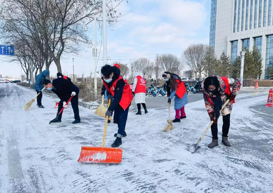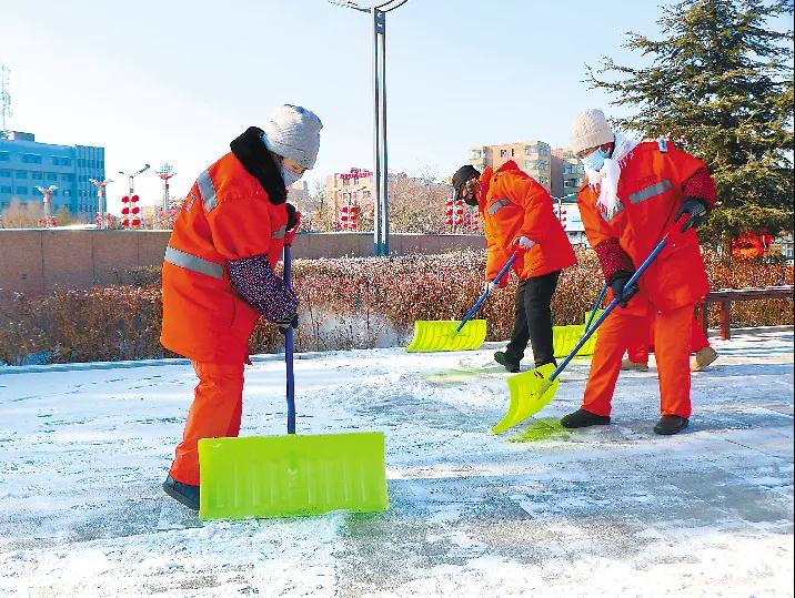 志愿者身穿红马甲,冒着严寒,或握帚扫雪、或挥锹铲雪,全力清除道路积雪和暗冰。铲雪、除冰、清运,各个岗位协同作战、配合默契,大家奋勇争先、不甘落后。扫雪过程中,志愿者温馨提醒过路行人小心路滑”“慢点走,注意安全,用热情融化着冰雪,用爱心温暖着人心。昨天晚上雪虽然下得不大,但由于气温较低,广场和步行街的雪一点融化的迹象都没有。今天一大早,我们就开始铲雪除冰,争取尽快把路面清扫出来,为市民出行提供便利。环卫工人许晓琴说。