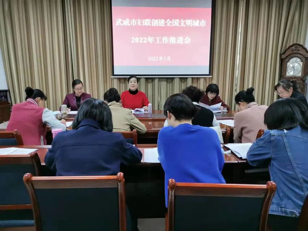 为进一步推进市妇联创建全国文明城市工作,积极发挥妇联组织及广大妇女群众和家庭在创建全国文明城市工作中的作用,3月30日,市妇联召开创建全国文明城市2022年工作推进会。会议由市妇联党组书记、主席康金莲主持,市妇联全体干部、凉州区妇联分管负责同志参加了会议。