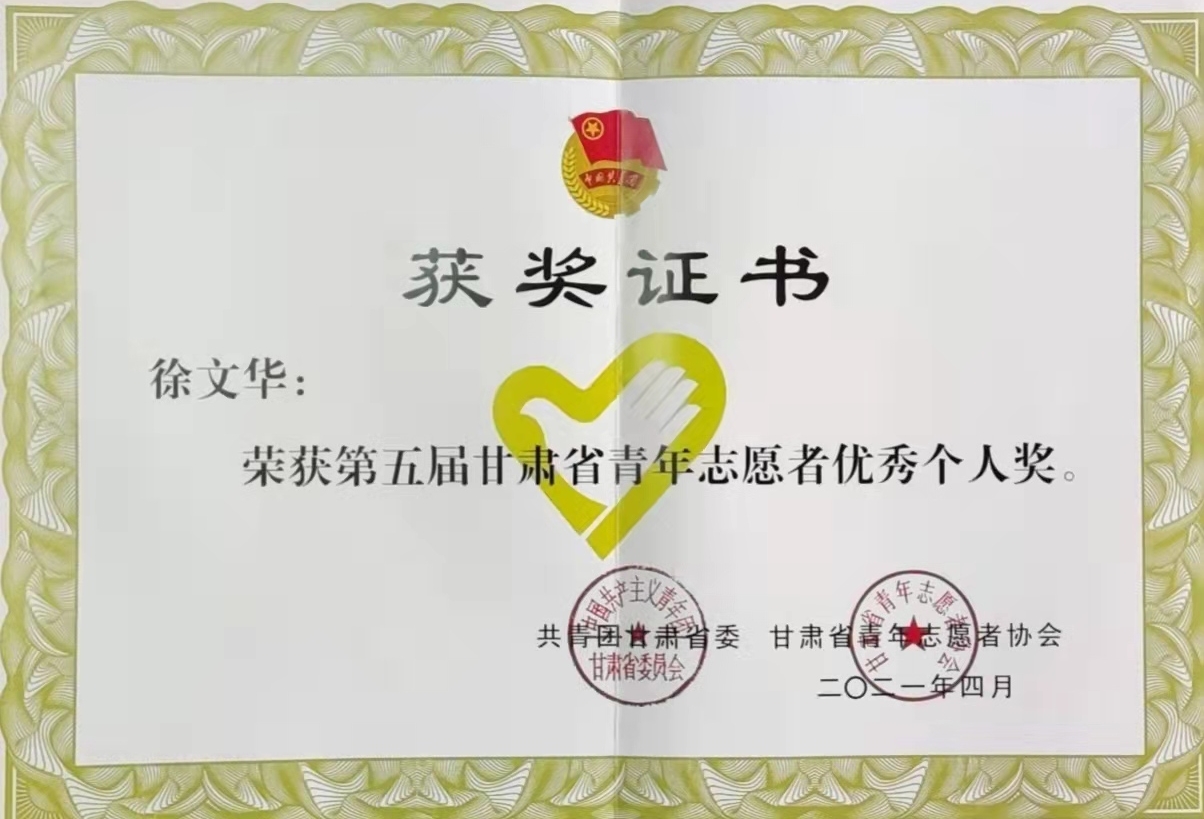 付出就有爱的回报,在2021年全市优秀志愿服务团队评选活动中,她所在的团队被共青团武威市委、武威市青年志愿者协会授予2020年度“武威市优秀青年志愿者组织”荣誉称号;