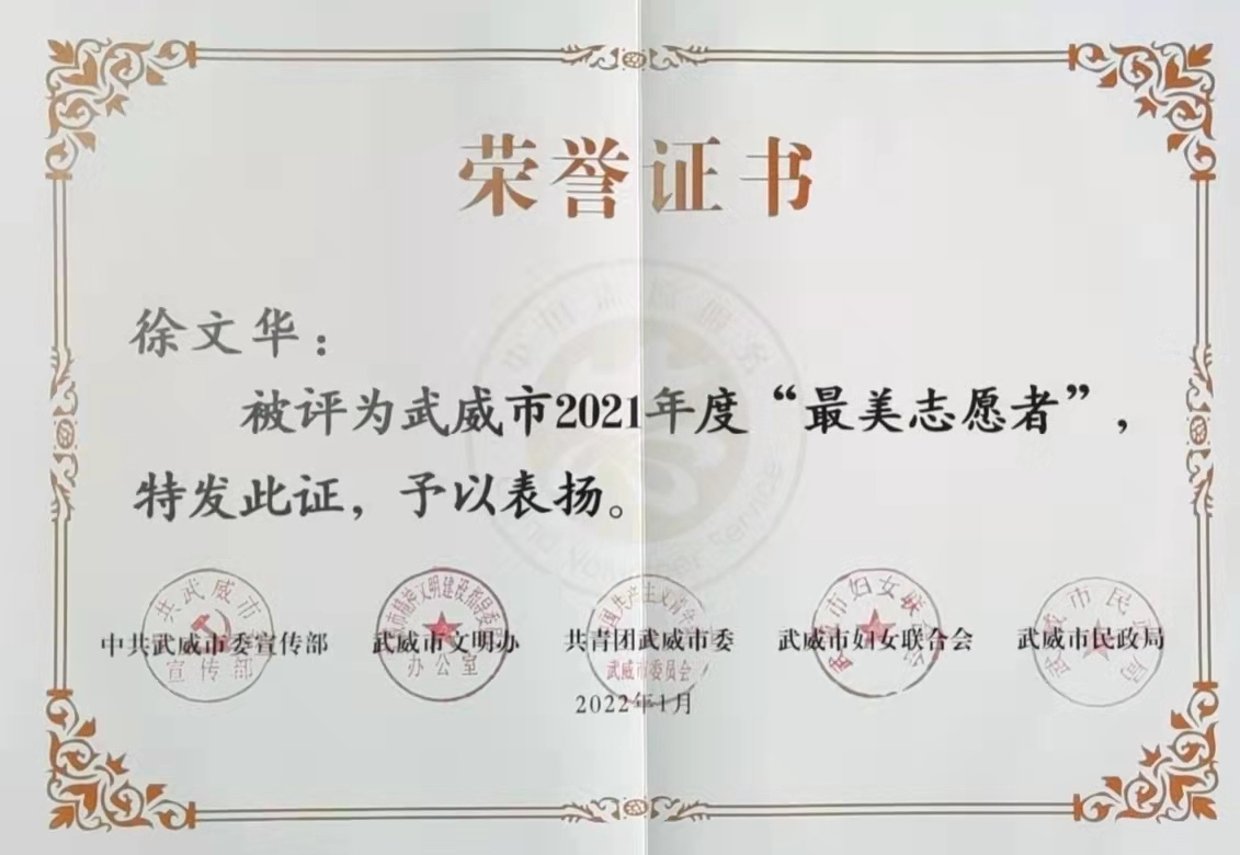 2022年1月,中共武威市委宣传部等5部门授予团队武威市2021年度“最佳志愿服务组织”;雨露助学“1+1”项目被评为武威市2021年度“最佳志愿服务项目”;本人被评为武威市2021年度“最美志愿者”、“最美武威人”。