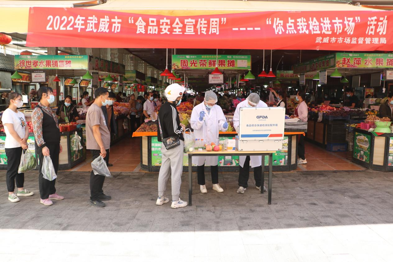 为积极发挥市场监管职能作用,聚焦群众关心的热点、难点问题。在食品安全宣传周活动期间,市、区市场监管部门坚持把食品安全宣传与检验检测紧密结合,在农贸市场、凉州区京华超市等单位开展你送我检、你点我检”诚信宣传活动,让更多消费者直观了解食品安全快速检测全过程,“零距离”把控“舌尖上的安全”,切实为守护消费者“菜篮子”筑起了一道“防火墙”。