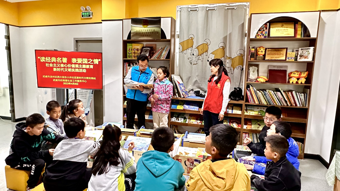 4月8日上午,武威市凉州区西大街东小井社区新时代文明实践站开展读经典名著·表爱国之情社会主义核心价值观主题教育文明实践活动。