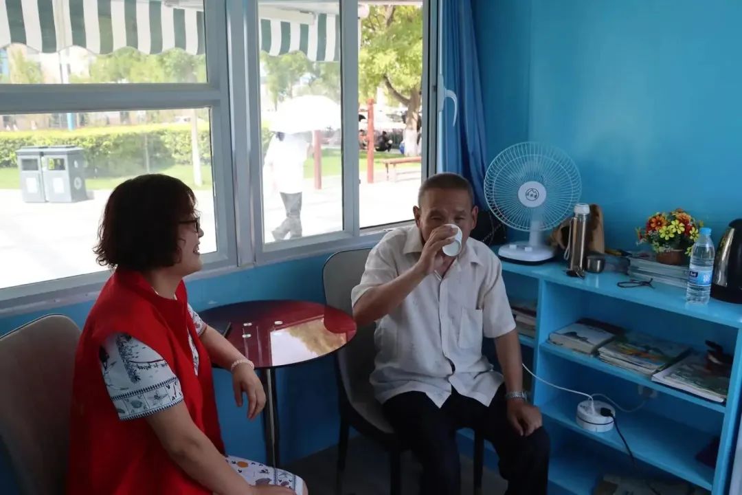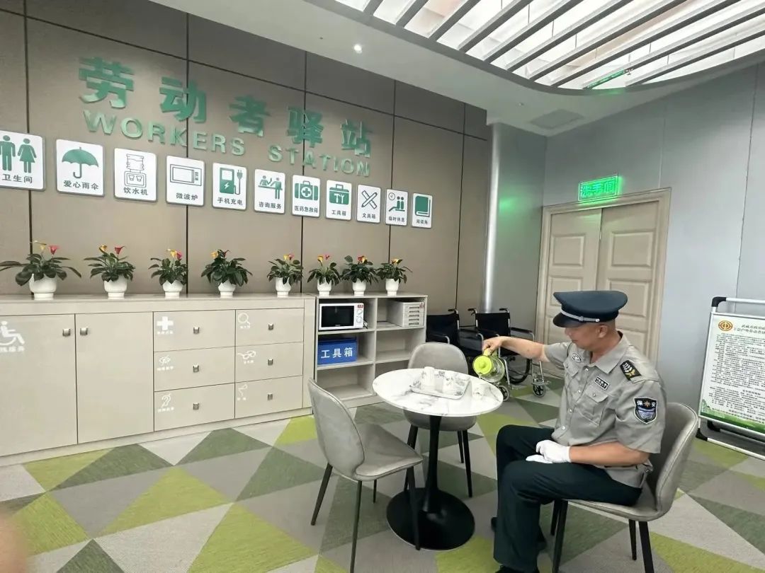 “这会太热了,我去‘户外劳动者驿站’倒杯水,你去吗?”