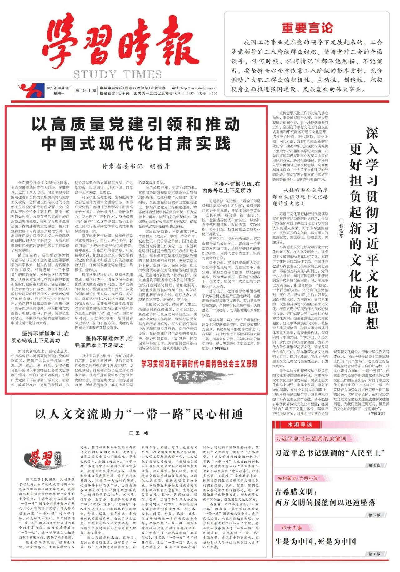 踏上新征程,我们要深刻领悟习近平总书记关于党的建设的重要思想的科学体系、基本内涵、实践要求和重大意义,准确把握“十三个坚持”的理论渊源、发展脉络和内在逻辑,认真落实新时代党的建设总要求和新时代党的组织路线,锚定党的二十大擘画的宏伟蓝图,扭住幸福美好新甘肃建设的目标任务,增强兴党强党的使命感,提振担当作为的精气神,始终把坚持和加强党中央集中统一领导作为最高原则,深入推进党的政治、思想、组织、作风、纪律及制度建设,不断以高质量党建引领推动中国式现代化甘肃实践。