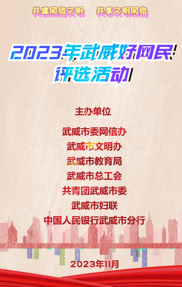为深入贯彻落实习近平总书记关于培育中国好网民的重要指示精神,加快推进网络文明建设,全面实施争做新时代武威好网民工程,团结引领全市广大网民共建网上美好精神家园,为武威高质量发展凝聚强大网上正能量,市委网信办、市文明办、市教育局、市总工会、团市委、市妇联、中国人民银行武威市分行等单位决定联合开展2023年度“武威好网民”评选活动。