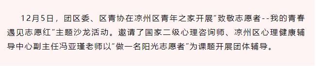 12月5日,团区委、区青协在凉州区青年之家开展青春故事分享,4名来自不同行业的青年志愿者分享了他们的志愿故事,讲述了他们的志愿初心。