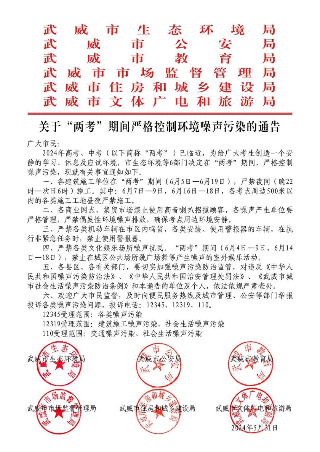 2024年高考、中考(以下简称“两考”)已临近,为给广大考生创造一个安静的学习、休息及应试环境,市生态环境等6部门决定在“两考”期间,严格控制噪声污染,现就有关事宜通知如下。
