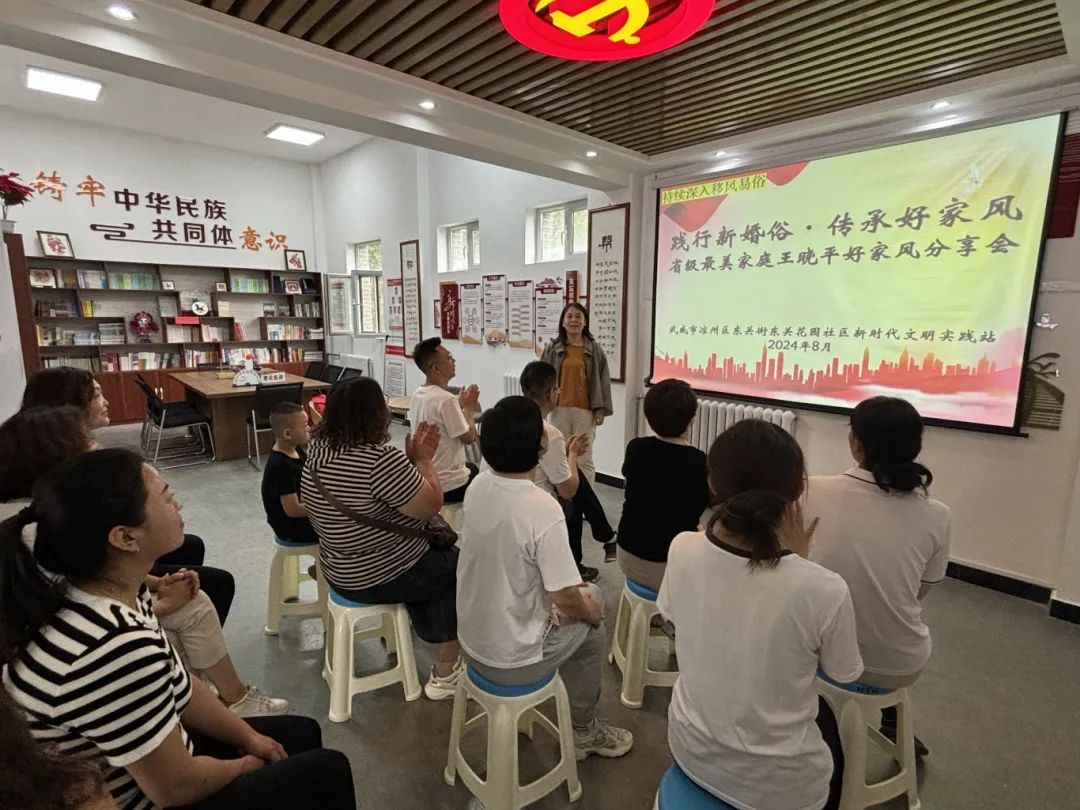 凉州区东关街东关花园社区新时代文明实践站开展“践行新婚俗·传承好家风”故事分享会,邀请“最美家庭”代表阐述弘扬辛勤劳动之风、节俭节约之风、诚实守信之风、孝亲敬老之风的重要意义,引导居民弘扬传统美德、传承良好家风。