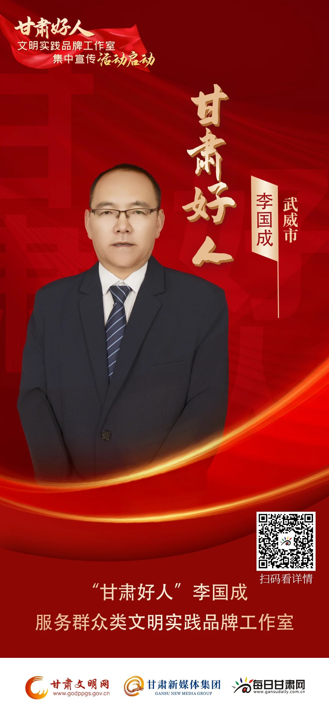 为切实发挥“甘肃好人”示范引领作用,进一步拓宽新时代文明实践阵地建设的覆盖面和影响力,省文明办于2022年11月起组织实施了“甘肃好人”文明实践品牌工作室项目建设,旨在推动文明实践由乡村示范点向城区品牌工作室拓展,将服务触角延伸到群众家门口,架起服务群众连心桥,实现服务群众“零距离”。今天,让我们带您一起走进“甘肃好人”李国成服务群众类文明实践品牌工作室,一同感受他们无私奉献书写无悔人生的感人故事。