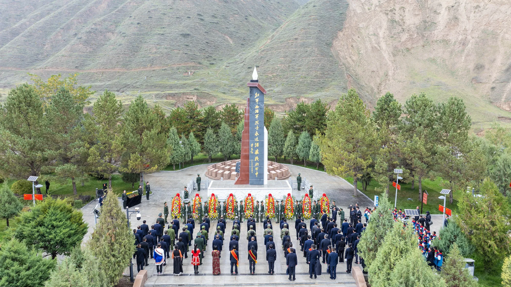 纪念碑前,以中共武威市委,市人大常委会,市政府,市政协,驻武解放军和武警部队,各民主党派、市工商联和无党派人士,各人民团体和各界群众,老战士、老同志和烈士亲属,武威市少年先锋队敬献的9个大型花篮一字排开,花篮红色缎带上书写的“烈士永垂不朽”格外醒目。