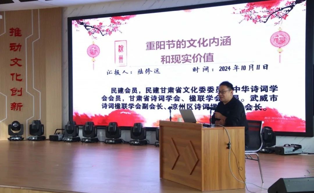 10月11日,区委宣传部、区文明实践办、区文联承办重阳节系列活动,在区文化馆三楼报告厅,举办《重阳节的时代意义和现实价值》为题的文学主题讲座,向现场观众分享放纸鸢、插茱萸、赏菊等重阳节传统习俗的寓意和美学内涵。