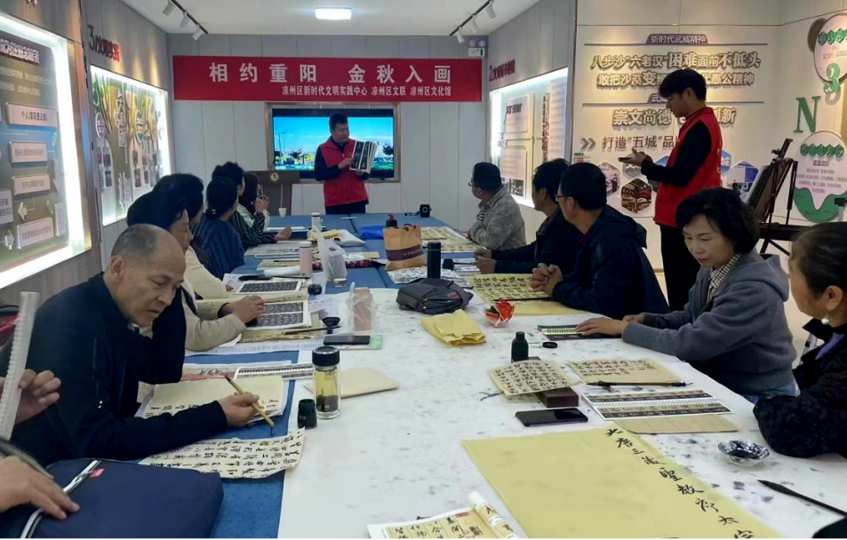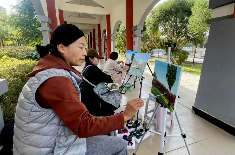 在区文明实践中心,来自区文化馆、区书法家协会、区美术家协会的文艺工作者将书画公益班搬到户外,带领老年学员进行户外采风、书法临摹、绘画写生,为老年学员详细讲解书画鉴赏知识,进行实践创作。