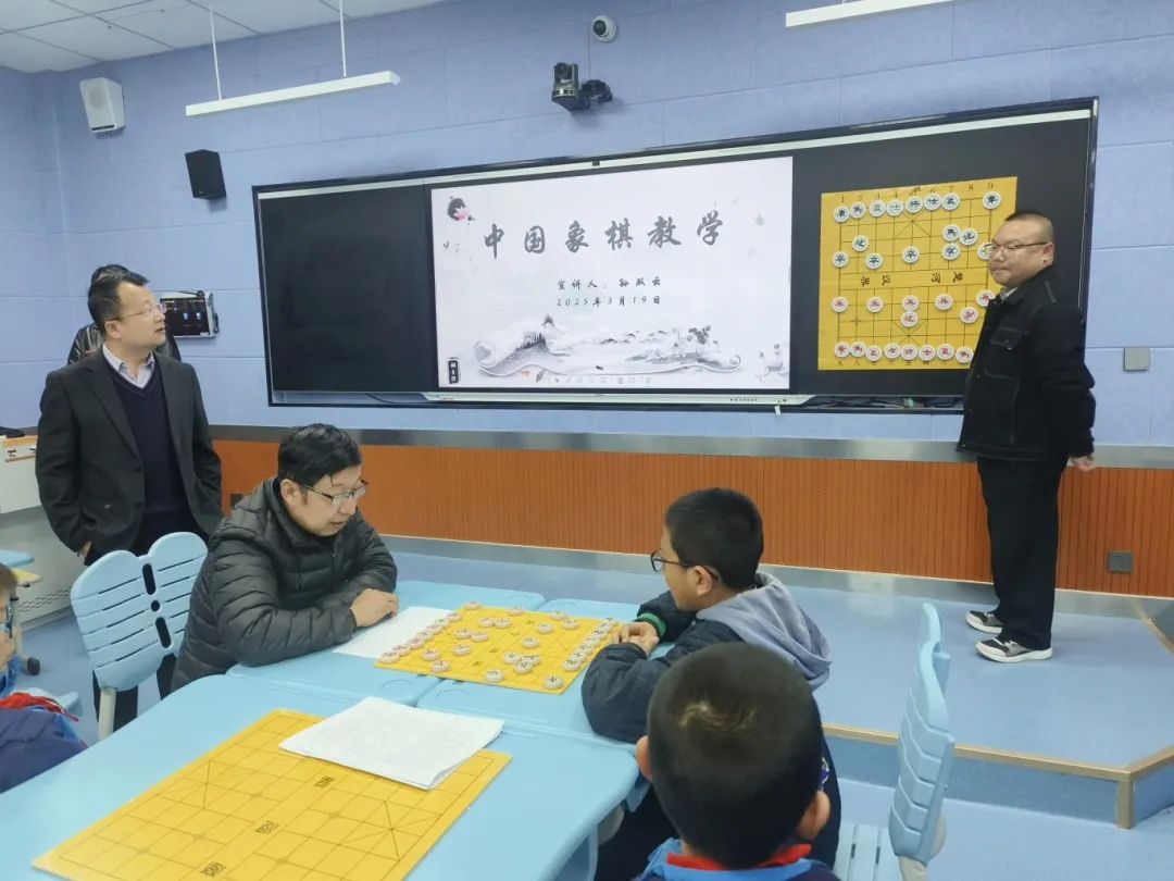 在象棋蒙目棋展示环节,王韬小棋士和我校工会主席翟友勇老师进行现场对决,同下一盘棋,他们凭着超强的记忆力和精湛的棋艺博得了现场师生的阵阵掌声。在互动环节,孙院长和小棋士走进学生中间,指导“三步杀”“两步杀”和“残局”的破解技巧,细致耐心地为他们一一答疑解惑。孩子们在一问一答中,茅塞顿开,棋艺的精粹和魅力悄然根植于他们的心中......