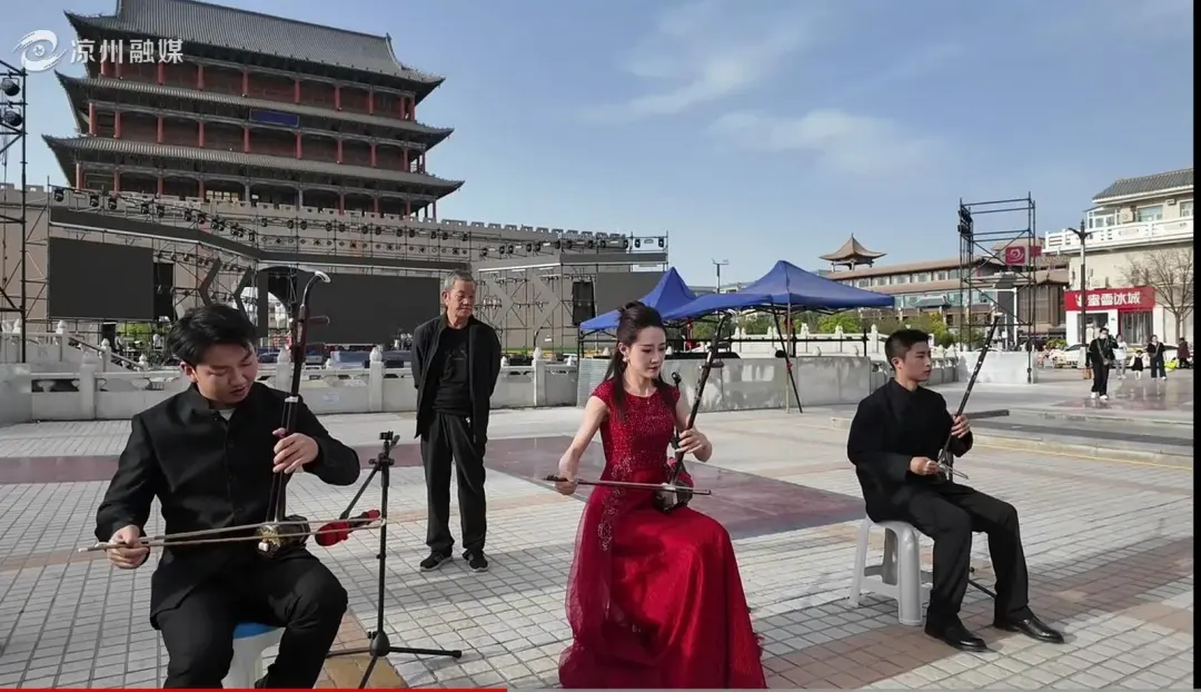 “五一”假期第三天,南城门广场成为舞台。小提琴的悠扬、古筝的典雅、二胡的醇厚,三种不同风格的器乐在此合奏。余晖洒在古老的城墙上,音乐与光影交织,演奏者们用旋律诉说着凉州千年的历史变迁。观众们不仅沉醉于美妙的音乐,还通过主播的讲解,深入了解每一处建筑背后的故事、每一段历史的沉淀,感受这座城市深厚的文化底蕴。