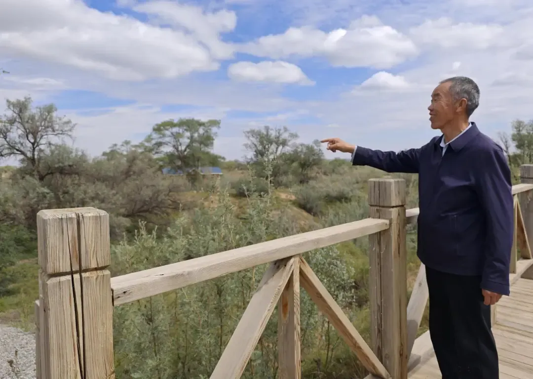 站在绿意盎然的八步沙,郭万刚轻抚着身旁茁壮生长的梭梭树,目光中满是欣慰与坚定。“现在坐在这里,刮的是清风,看着这些树,心里很欣慰。治沙不是一代人的事,我们要一代代干下去,让沙漠变绿洲。”看着八步沙一片片变绿,郭万刚的话语朴实却有力。对于郭万刚来说,“守住八步沙”是信守一生的承诺。他把青春年华奉献在茫茫黄沙里,从意气风发的青年成了两鬓染白的老人。从20世纪80年代中期开始,八步沙第一代治沙人或病故或退休,31岁的郭万刚接过父辈手中的铁锨,加入老人们未尽的治沙事业,成为八步沙第二代治沙人。从那以后,他与林场职工一起,不畏酷暑严寒,不惧风沙漫天,在沙漠中一干就是几十年。郭万刚带领着八步沙人,一步一个脚印,将绿色一点点向沙漠深处推进。