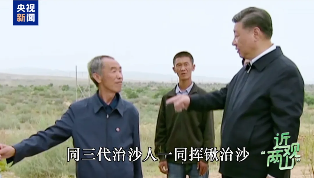 在甘肃八步沙林场,习近平总书记实地了解治沙情况,亲自拿起一把开沟犁,同治沙人一同挥锹治沙。总书记称赞,“你们这里树立了榜样,新时代的愚公,所以要向你们学习”。